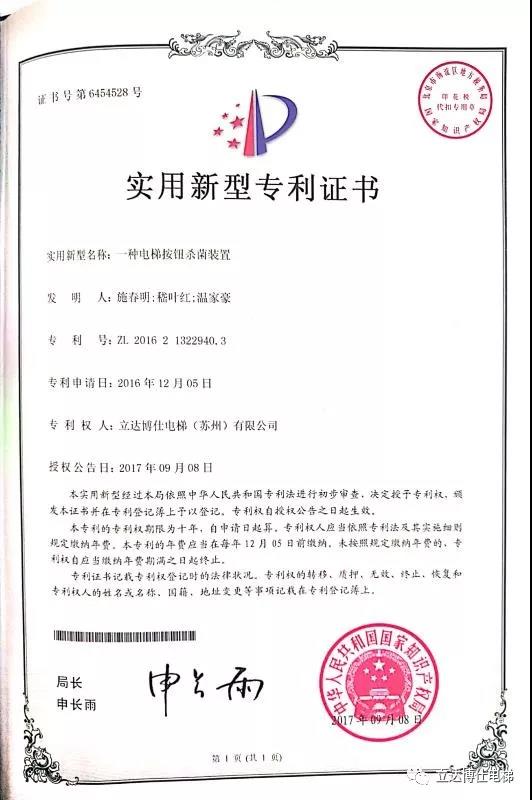 “宜未雨而綢繆,毋臨渴而掘井”,立達博仕電梯作為一家專業的整梯制造單位,多渠道聽取客戶反饋,切實有效的制定相應方案,于2016年12月已申請實用新型專利《一種電梯按鈕殺菌裝置》。該項專利通過加裝一套具有殺菌殺毒的外部裝置于電梯操縱箱表面,實現日常消毒功能,且人為可控制該裝置移動與換洗,有效阻斷細菌病毒殘留于電梯按鈕上,降低病菌二次傳播帶來的有害影響。該實用專利無需過高增加電梯使用單位成本,且清洗更換方便,適用于大部分無特殊使用環境下的電梯。